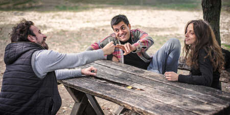 Group of friends having fun in the winter forest and drinking hot coffee