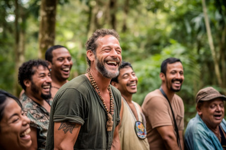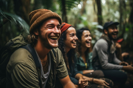 Group of friends having fun in the jungle. They are laughing and looking at camera.