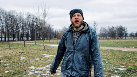 Consequences of drunkenness, alcoholism. Caucasian male tramp in dirty clothes and hat cap. Below poverty line. Beggar. Illegal immigrant