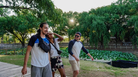 A cheerful group of friends laughing and enjoying each others company under the sun, A group of friends laughing together in a sunlit park