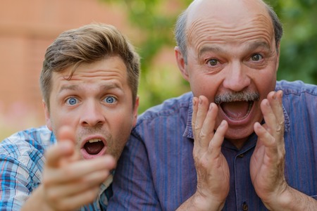 Two shocked men father and son looking at camera with opened mouth.