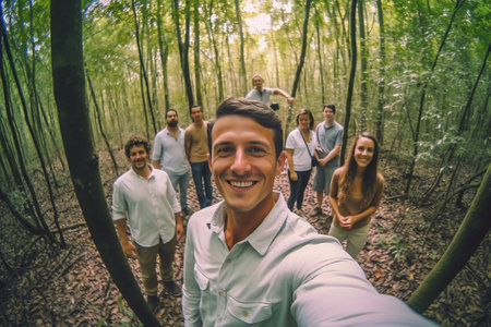 Generative AI : Happy young man take a selfie on a excursion in the forest at summer Beatiful guy taking a self portrait with his smartphone