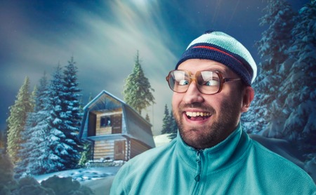 Squint-eyed retro skier in winter mountains at night