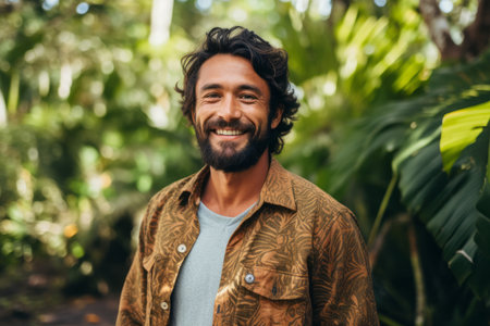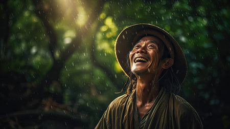 Image of positive young korean man smiling during rain in tropical forest. Cheerful male enjoying the rain outdoors. Ai generative