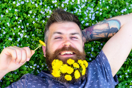 Relaxation concept. Guy with dandelions in beard relaxing, top view. Man with beard on happy face put hand behind head. Bearded man with dandelion flowers in beard lay on meadow, grass background