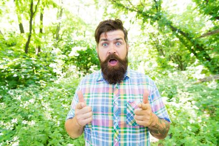 summer camping vacation. man hipster hiking. male beard care. brutal hipster in forest. discover new places. time for picnic. happy guy raised hands in celebrating. mature bearded man in cap