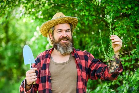 botanic worker. Trowel digging soil. Garden tools. seeds and soil. Spring in the garden. Farmer giving fertilizer. The gardener digging in garden. Work with garden trowel. mature man gardener