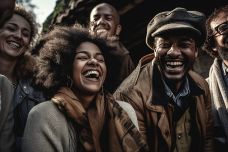 A group of people of different nationalities laughing. Different ages nationalities having fun together, having good time together laughing smiling. Enjoyment, relaxation respect peace. Generative AI.