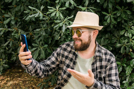Bearded man doing video call on smartphone outdoor - video connection and technologies concept