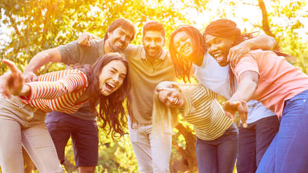 Laughing multicultural group of friends as a community while hugging in nature