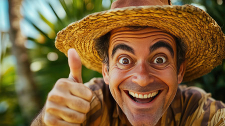 A man with smooth skin wearing a ridiculous oversized hat, grinning and making a thumbs-up gesture.
