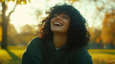 A woman with curly hair enjoys a joyful moment outdoors in a park filled with vibrant autumn leaves. The golden hour sun illuminates her cheerful expression.