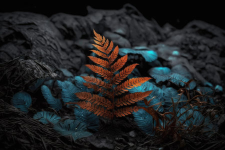 Autumn fern in the Polish mountains bathed in moody lighting and surrounded by fallen leaves