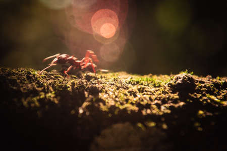 Macro shot of ant crawling on the ground with bokeh background