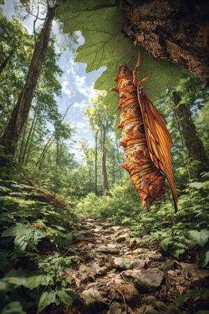 An insect with intricate details hangs beneath a leaf within a dense forest environment. The composition features a pathway leading into the scene, with lush vegetation and tall trees. Overhead sunlight filters through the canopy, creating shadows and enhancing the textures. This image suits various commercial applications, including editorial and design projects.