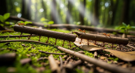 Ants working on a stick in the forest, teamwork concept.