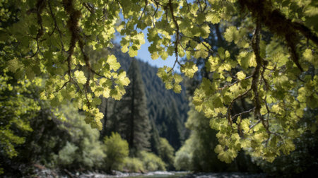 Sunlit river valley framed by lush green leaves and rocky mountain cliffs