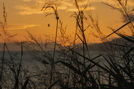 Close up on grass on lake shore at sunset.
