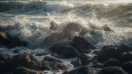 Breaking waves crash against rocky coastline, dramatic beauty generated by artificial intelligence