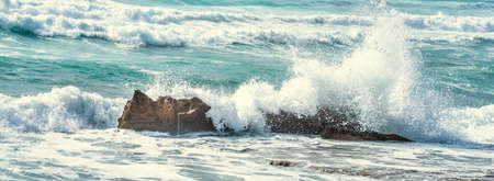 Storm on the coast. The waves hit the rocks and create foam.