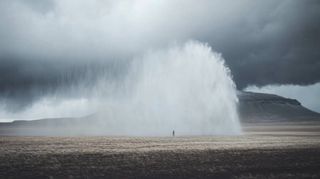 A stunning waterfall flows from ominous clouds, creating a dramatic scene in the Icelandic wilderness. A solitary figure adds a sense of scale to this breathtaking landscape.