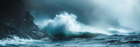 the dramatic contrast of a stormy sea, with towering waves crashing against rugged cliffs, showcasing the raw power of nature.