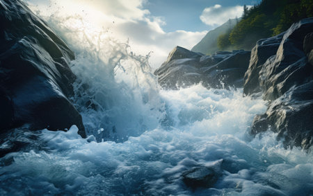 Vibrant blue streams cascade swiftly over rugged rocks, creating lively splashes that emphasize movement and vitality within a pristine, natural setting.