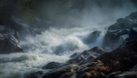 Rapid waves break on rocky coast, a stunning seascape adventure generated by artificial intelligence