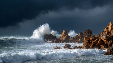 Powerful ocean waves crash against rugged rocks under an ominous sky, capturing the raw beauty and intensity of nature. A stunning coastal landscape at dusk.