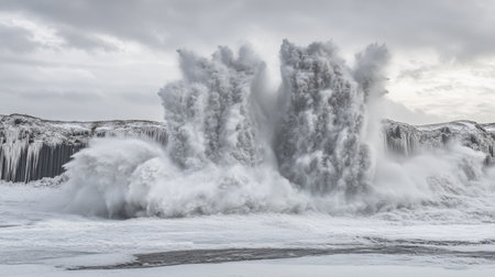Powerful waves crash over the vast expanse of the Arctic Ocean, creating a dynamic and mesmerizing display of natures force and beauty.