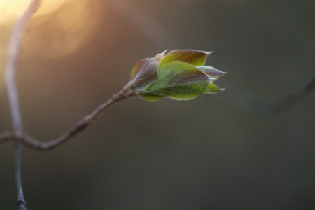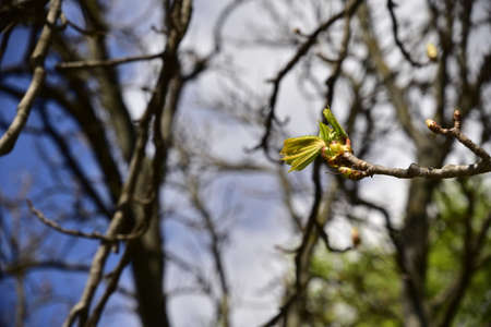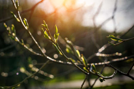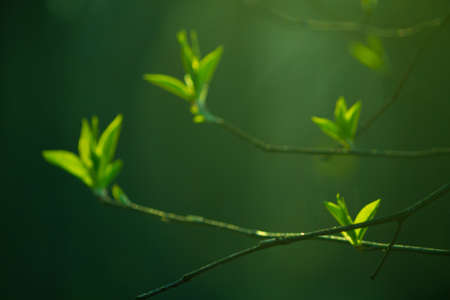 Early spring tree branch spouts fresh green close up shot in the forest shallow depth of field 2020