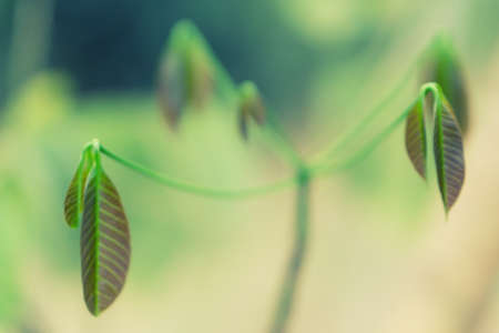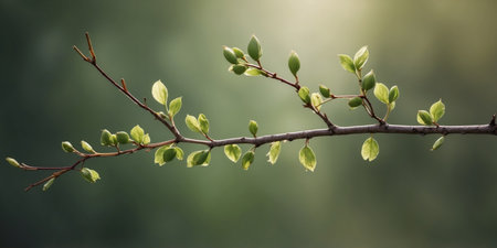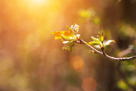 Closeup view on a tree branch with fresh blooming foliage. Blurred background