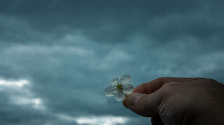 A closeup of a hand holding a small pink flower under a blue sky with a blurry background