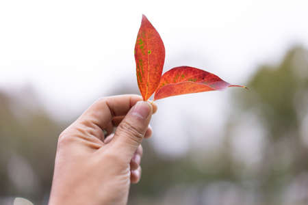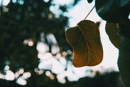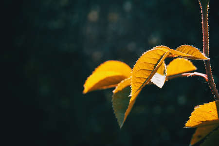 Last few leaves on a branch, beautiful golden orange color, illuminated with the sun, one with heart shaped hole