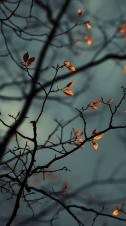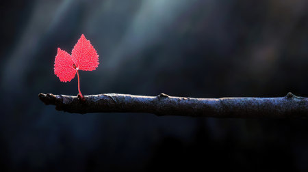 A striking composition featuring vibrant red leaves perched on a bare branch, illuminated by soft light against a dark backdrop, symbolizing beauty and resilience.
