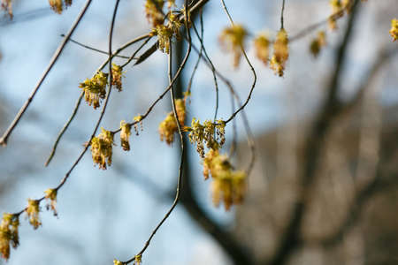First, early spring, flowering, budding of trees, branches, leaves, background, free space, maple tree seeds Beautiful flowering awakening development sunny day