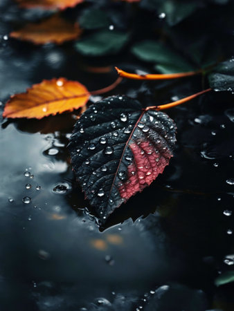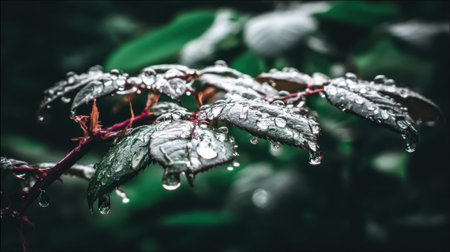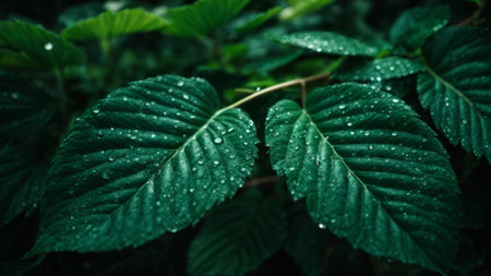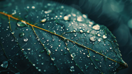 A macro photograph capturing the intricate beauty of nature with sparkling raindrops resting on the surface of leaves against a dark blurred green background.