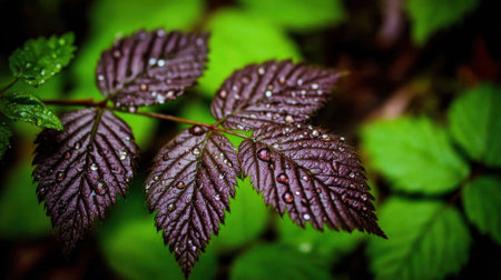 A stunning macro shot captures the intricate texture of dark purple leaves adorned with sparkling water droplets, set against a soft, vibrant green background.