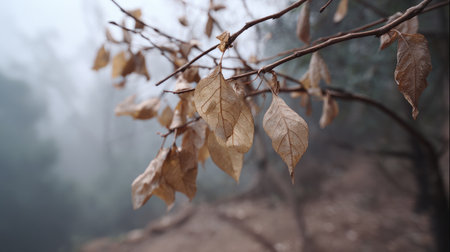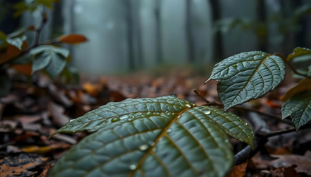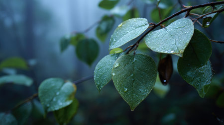 This serene nature image features softly blurred leaves against a misty background, evoking a sense of tranquility and connection to the peaceful outdoors.