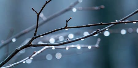 water drops on tree branches, cold blue background, the beginning of vegetation