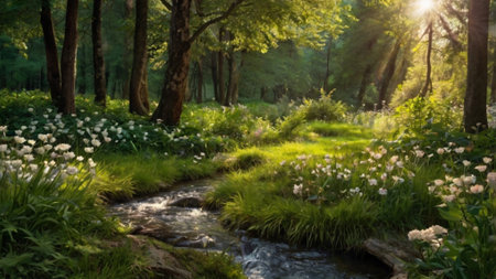 A serene stream flows through a vibrant forest, with clear water glistening and lush moss covering the rocks. Sunlight filters through the trees, creating a peaceful atmosphere.