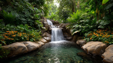 waterfall in deep forest with rocks and green leaves in the morning