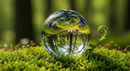 Close up of a clear glass ball sitting on top of a mossy log in the woods. The moss is green and lush, and growing on the log with blurring background. Transparent crystal ball placed on log. AIG35.