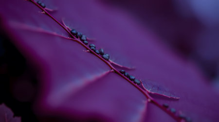 Close up of a purple leaf with black berries in the garden.