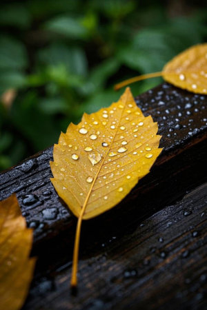 Yellow fallen leaves with water droplets on wooden boards