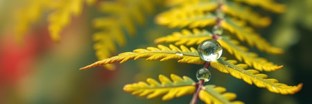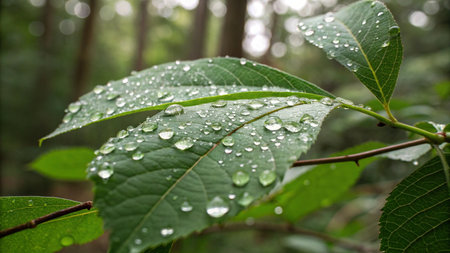 Captivating close-up of leaves adorned with glistening water drops, showcasing nature's beauty at twilight in vibrant colors and intricate details.