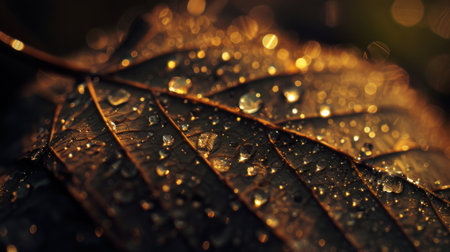 This close-up photograph captures water droplets on a leaf, illuminated by golden light, showcasing the intricate details and textures of nature. Perfect for nature themes.