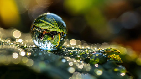 Delicate water droplets representing conservation floating gently through lush greenery. Generative AI