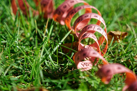 Fit centimeter on green grass measuring tape.