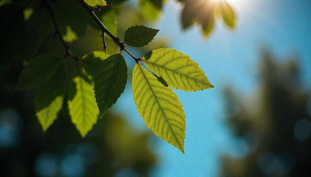 Sunlit green leaves against a blue sky background image